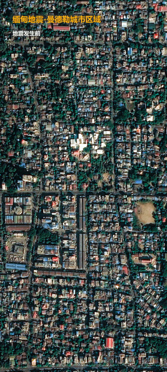 △缅甸地震受灾前后光学卫星图像(灾前:高分一号03卫星2025年3月16日采集,灾后:资源一号02D卫星2025年3月29日采集)
