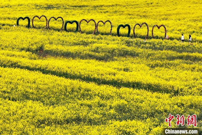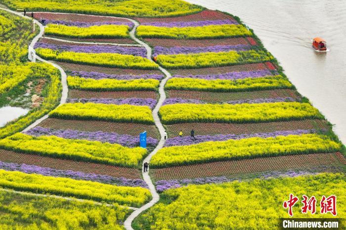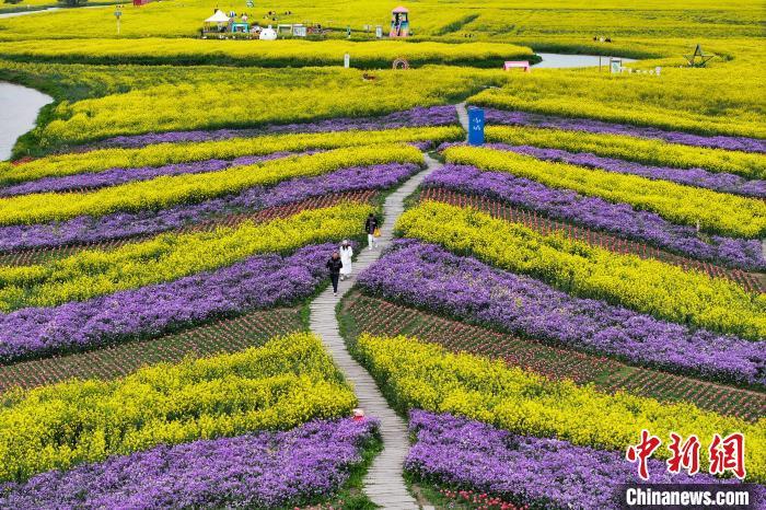 3月29日,江苏高邮,游客在高邮湖畔“湖上花海”游玩。(无人机照片)中新社记者 泱波 摄