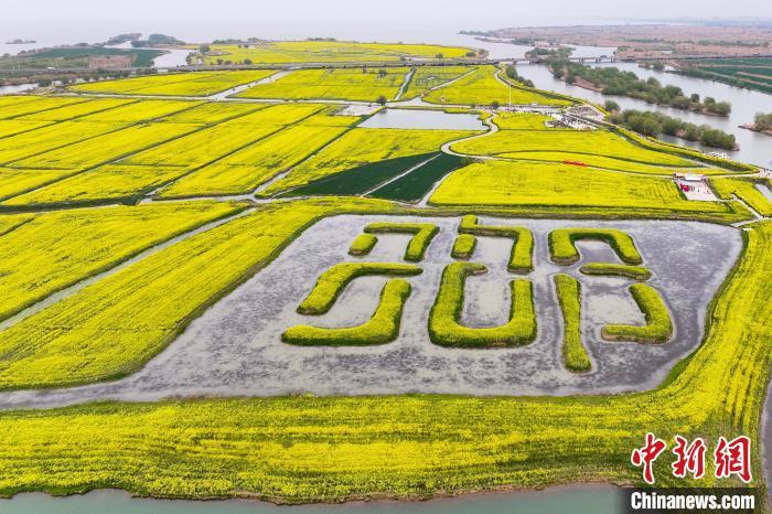 3月29日,江苏高邮,航拍高邮湖畔“湖上花海”。(无人机照片)中新社记者 泱波 摄