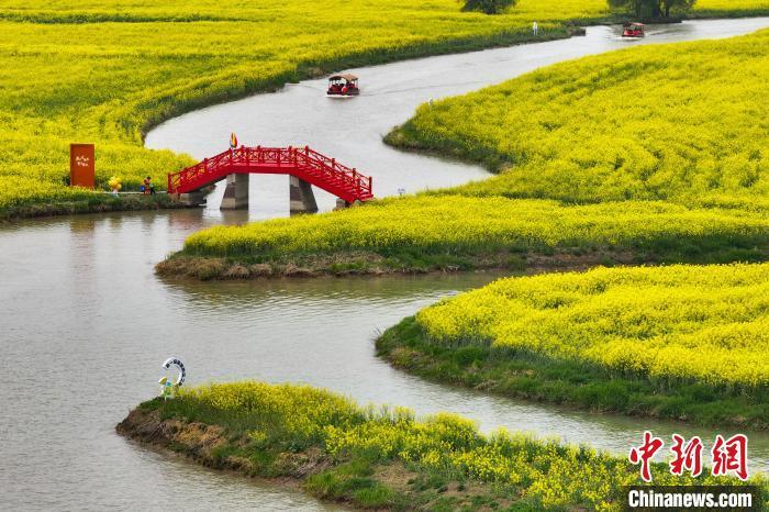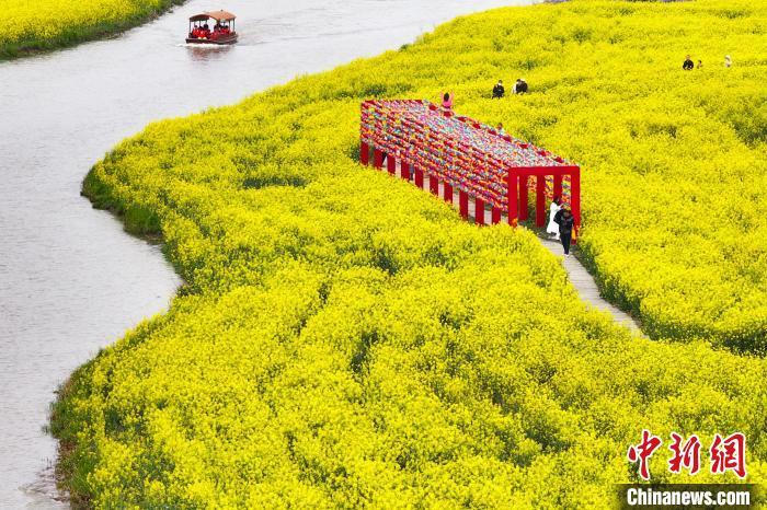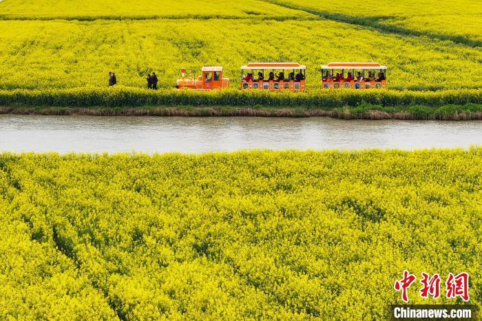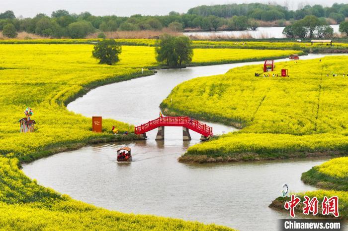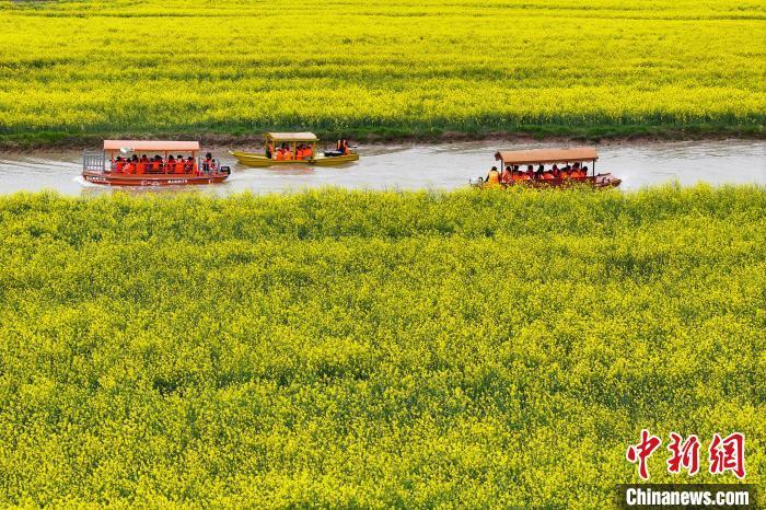 3月29日,江苏高邮,游客在高邮湖畔“湖上花海”乘船游玩。(无人机照片)中新社记者 泱波 摄