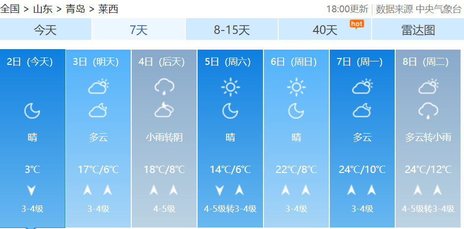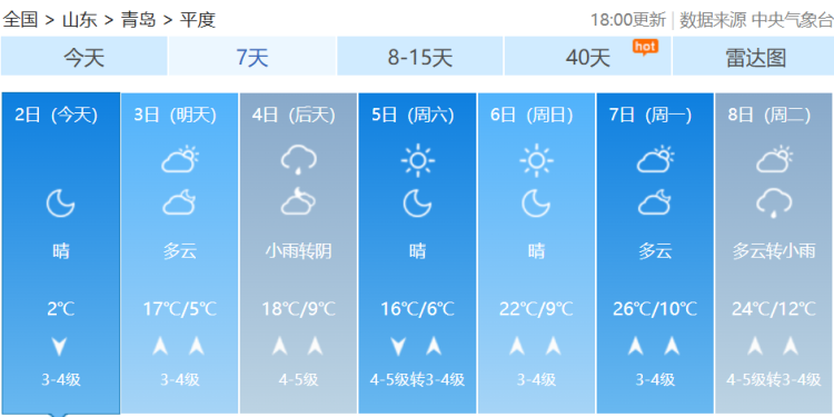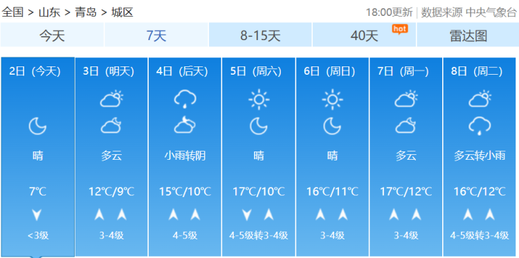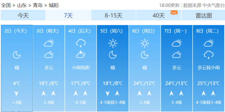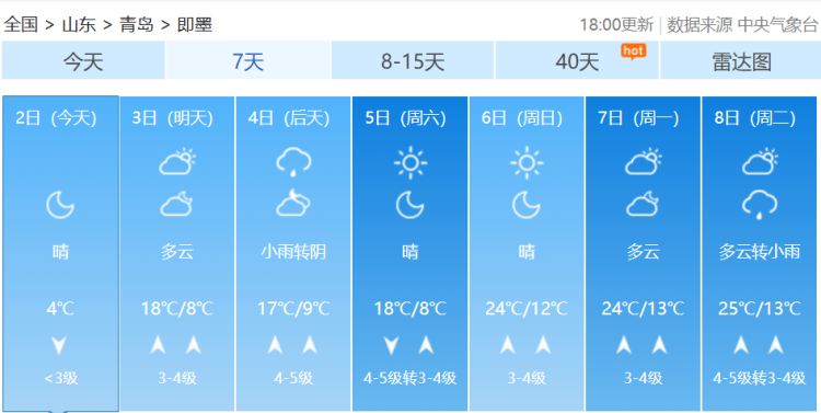 4日白天我市有阵雨或雷雨,全市累计平均降雨量3毫米以下。南风转北风,陆地可达4~5级阵风7~8级,近海海域6~7级阵风8级,雷雨时阵风8~9级。最低气温7~10℃,最高气温15~18℃。