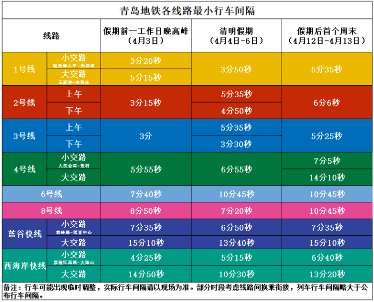 清明假期(4月4日-6日),1、2、3、4、8号线以及蓝谷快线、西海岸快线共7条线路行车间隔较日常周末有所压缩,最小行车间隔3分30秒。