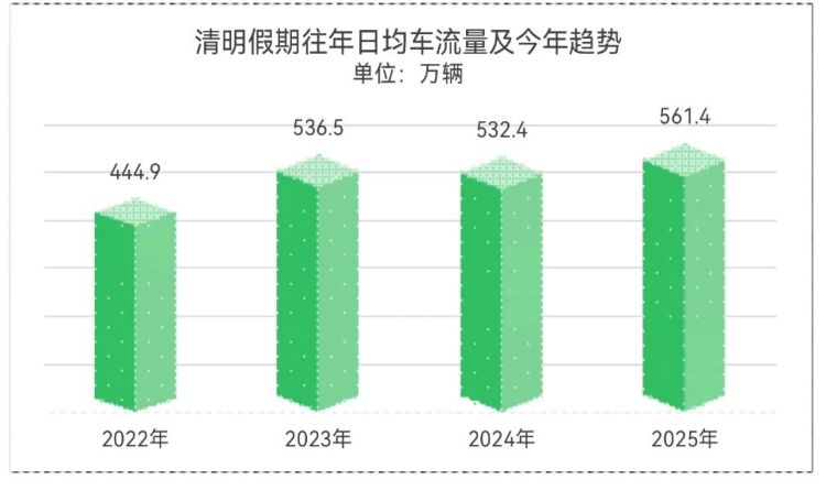 清明节是扫墓祭祖、踏青赏花的传统节日,预计周边游、短途游占出行主流,预计近郊高速公路交通压力攀升,或现短时拥堵缓行现象。结合往年假期出行规律和近期车流量预测,预计今年清明假期全市在途车流量日均约561.4万辆,较2024年增长5.4%,较3月日均值增长1.4%。