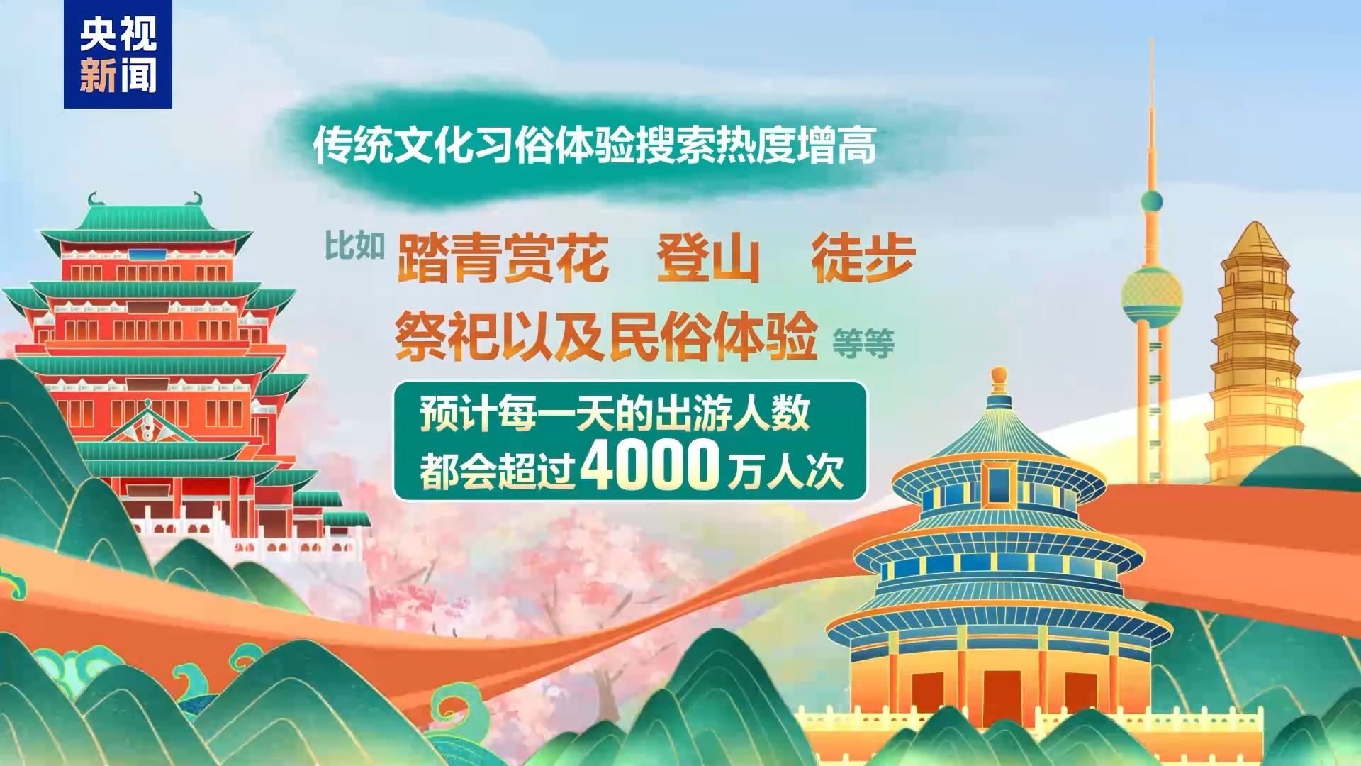 根据中国旅游研究院的数据,这个清明节假期,居民出游意愿达到74%,传统文化习俗体验搜索热度增高,比如踏青赏花、登山、徒步、祭祀以及民俗体验等,预计每一天的出游人数都会超过4000万人次。
