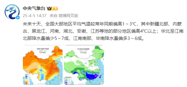 未来十天,全国大部地区平均气温较常年同期偏高1~3℃,其中新疆北部、内蒙古、黑龙江、河南、湖北、安徽、江苏等地的部分地区偏高4℃以上;华北至江南北部降水量偏少5~7成,江南南部、华南降水量偏多3~6成。