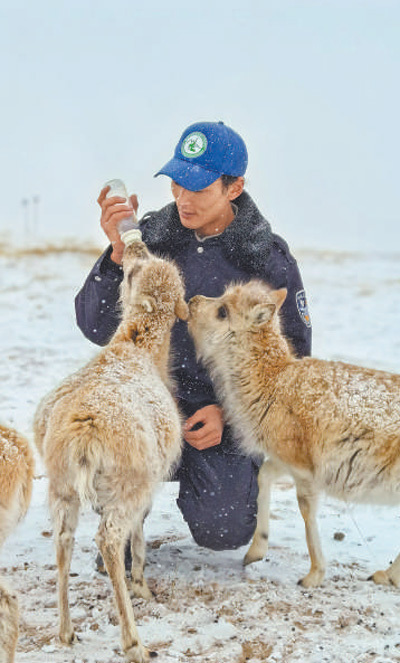 索南达杰保护站往后走,是一大片有围栏的草场。巴义尔模仿藏羚羊发出口哨声,没多会儿,远处的小山坡露出几个脑袋。看到是巴义尔过来,几个小家伙跑了过来,巴义尔拿出奶瓶,一手揽着小藏羚羊,亲切地摸摸小羊的脑袋。“这都是我们去年救助的小藏羚羊,在这喂养一年恢复野性后,再放归自然。猎隼等鸟类也是我们的救助对象。”巴义尔说。