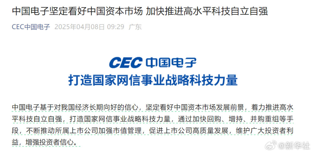 中国电子信息产业集团有限公司8日宣布,中国电子坚定看好中国资本市场 ,加快推进高水平科技自立自强。中国电子基于对我国经济长期向好的信心,坚定看好中国资本市场发展前景,着力推进高水平科技自立自强,打造国家网信事业战略科技力量,通过加快回购、增持、并购重组等手段,不断推动所属上市公司加强市值管理,促进上市公司高质量发展,维护广大投资者利益,增强投资者信心。(记者:温竞华 陈宇轩)