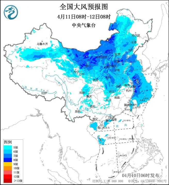 11日至12日,西北地区、内蒙古、华北、黄淮、江汉、江淮、东北地区南部、江南东北部及东部海域将有5至7级偏北风,阵风8至10级,其中西北地区东部、内蒙古、华北、黄淮东部、东部海域阵风风力可达9至11级,局地12至13级,华北、黄淮东部局地风力将突破4月历史同期极值;13日,内蒙古中东部、华北、黄淮、江淮等地仍有5至7级偏北风,阵风8至10级,局地11至12级。