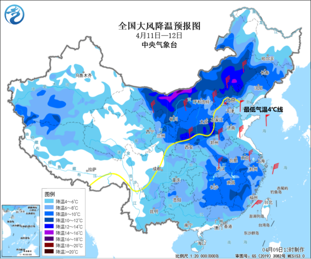 11日至12日,我国中东部大部地区气温将普遍下降6至10℃,其中,西北地区东部、内蒙古中西部、华北西部和北部、江南东部等地局地降温幅度可达12至16℃;降温过后,最低气温4℃线将位于河北北部、山西南部至甘肃南部一带。