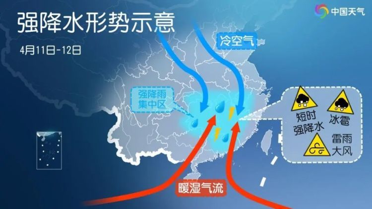 ▲强降水形势示意(4月11日-12日) 据中国天气网
