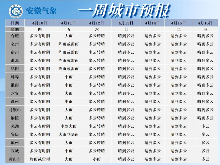 11日: 全省阴天,沿淮淮北地区有小到中等阵雨或雷雨;淮河以南有中等阵雨或雷雨,其中江淮之间南部和江南部分地区大雨到暴雨。