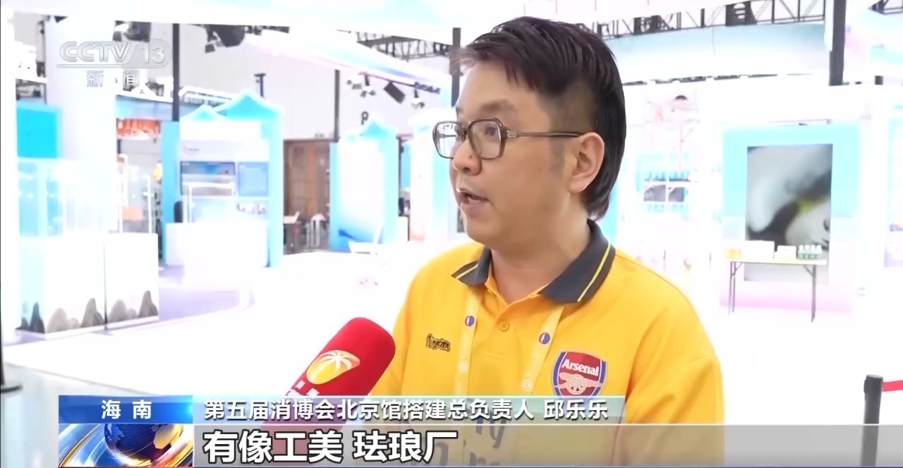 第五届消博会北京馆搭建总负责人 邱乐乐:这次北京也带来25家企业,有像工美、珐琅厂、菜市口百货这些老企业,也有新媒体的企业。