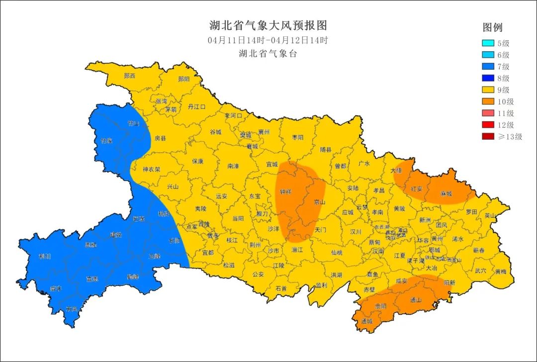 4月10日,长江云新闻记者了解到,11日午后至12日白天,受冷空气影响,全省自西向东将有大风降温降雨过程,大风具有极端性,偏北阵风7到9级、局地10到11级,平均气温下降6~10℃;其中11日南部和东部地区有中到大雨、局地暴雨,伴有强对流。今天下午湖北省气象台已发布大风黄色省级预警。