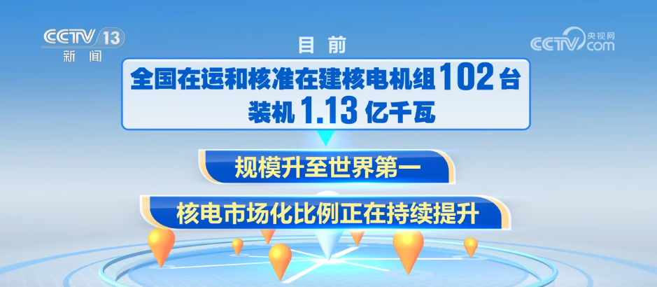 目前,全国在运和核准在建核电机组102台、装机1.13亿千瓦,规模升至世界第一,核电市场化比例正在持续提升。2024年,江苏徐圩等5个项目的11台机组获得核准,连续三年核准机组数量达到或超过10台。