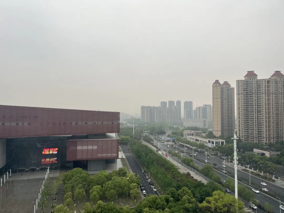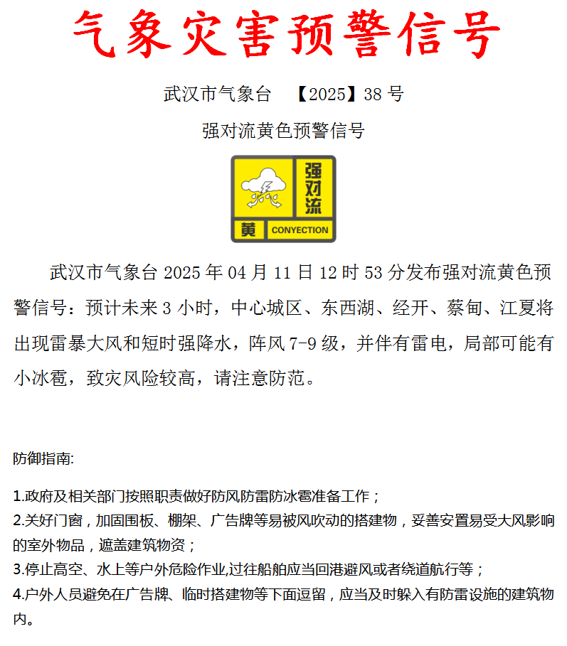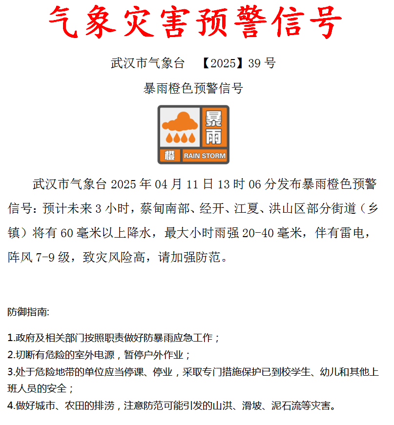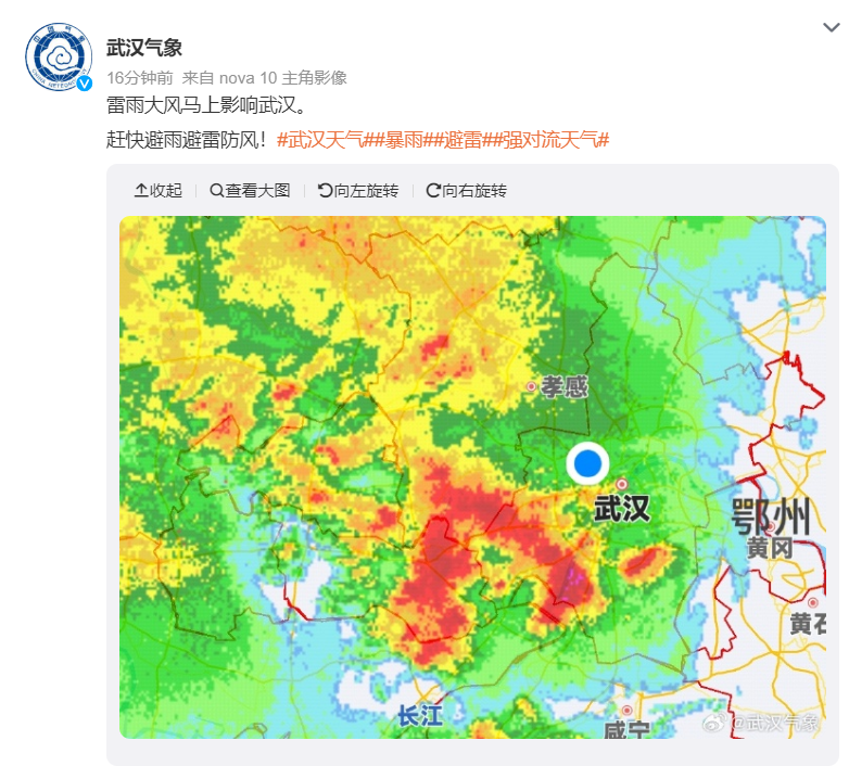 13时10分许,武汉市民之家附近电闪雷鸣,下起雨来。
