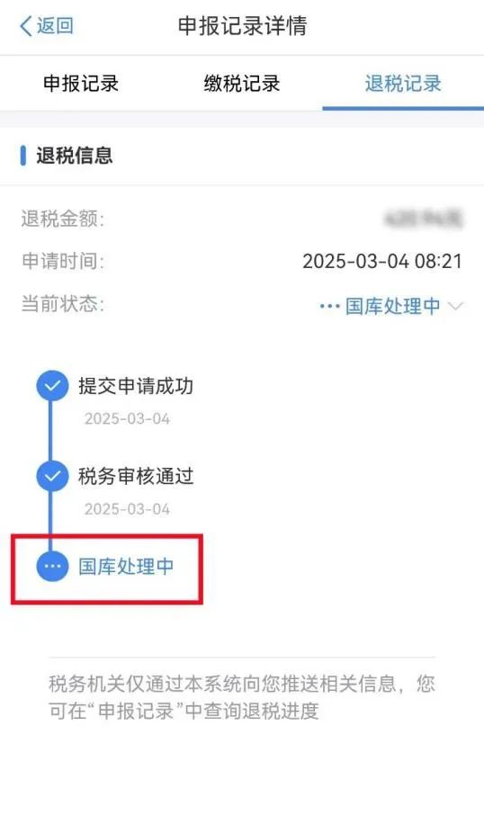 “国库处理中”表示税务机关已审核通过,并将您的退税申请提交国库,国库正在按规定处理,请耐心等待。处理完成后,税款将由国库退至您填写的银行账户。