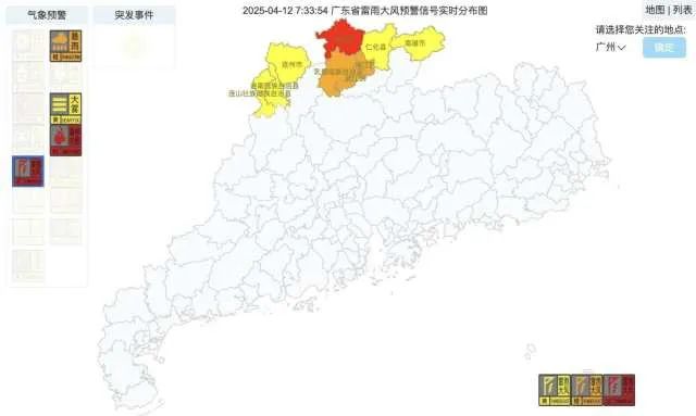 截至12日7时33分,广东已发布14个“风雨预警”信号(暴雨:1橙+4黄,雷雨大风:1红+3橙+5黄)。