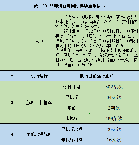 记者从郑州新郑国际机场了解到,截至9:25,郑州新郑国际机场运行正常,今日计划执行航班502架次,已执行34架次,取消2架次。另外,郑州至呼和浩特、桂林至郑州、温州至郑州等三个航班取消,有郑州至上海、喀什,沈阳至郑州等5个航班延误。