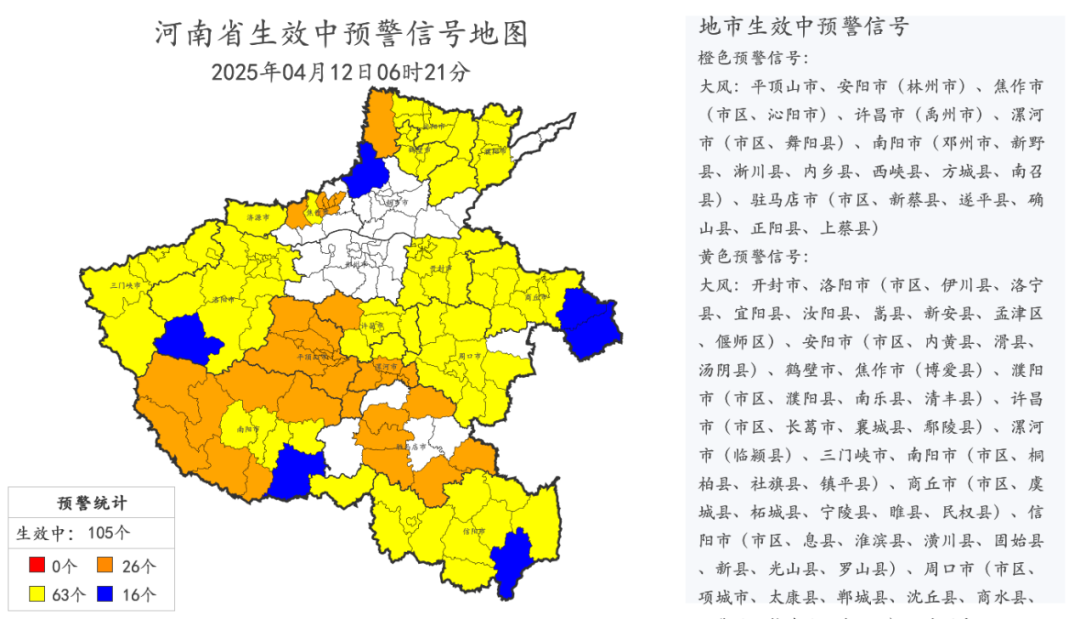 4月12日6时21分河南省生效中预警信号地图