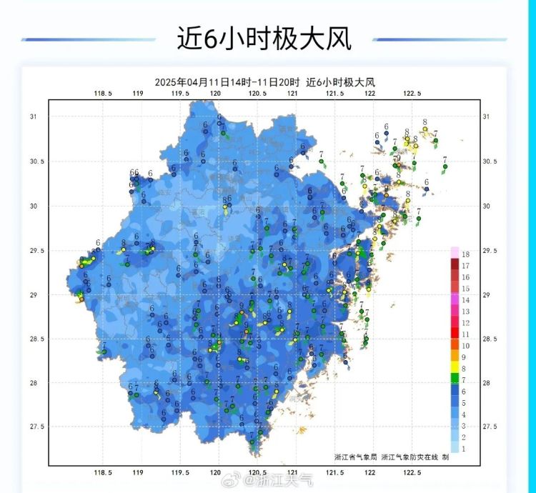 今天白天浙中北部分出现6-9级