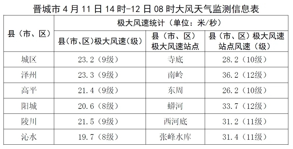 截至12日08时,全市132个站,最大风力均达到6级以上。其中有3个站风力达到12级(32.7-36.9米/秒),分别是泽州南岭、阳城蟒河、阳城西交。12个站风力达到11级(28.5-32.6米/秒),20个站风力达到10级(24.5-28.4米/秒)。
