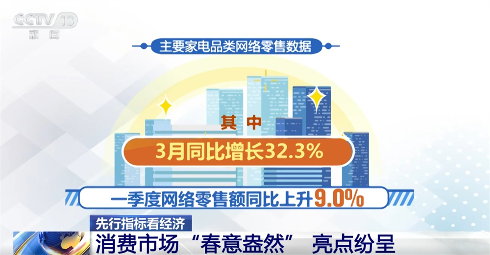 此外,“以旧换新”政策持续显效。国家信息中心监测主要家电品类网络零售数据显示,一季度网络零售额同比上升9.0%。其中3月同比增长32.3%,显示春季家装旺季带动家电换新需求正加快释放。
