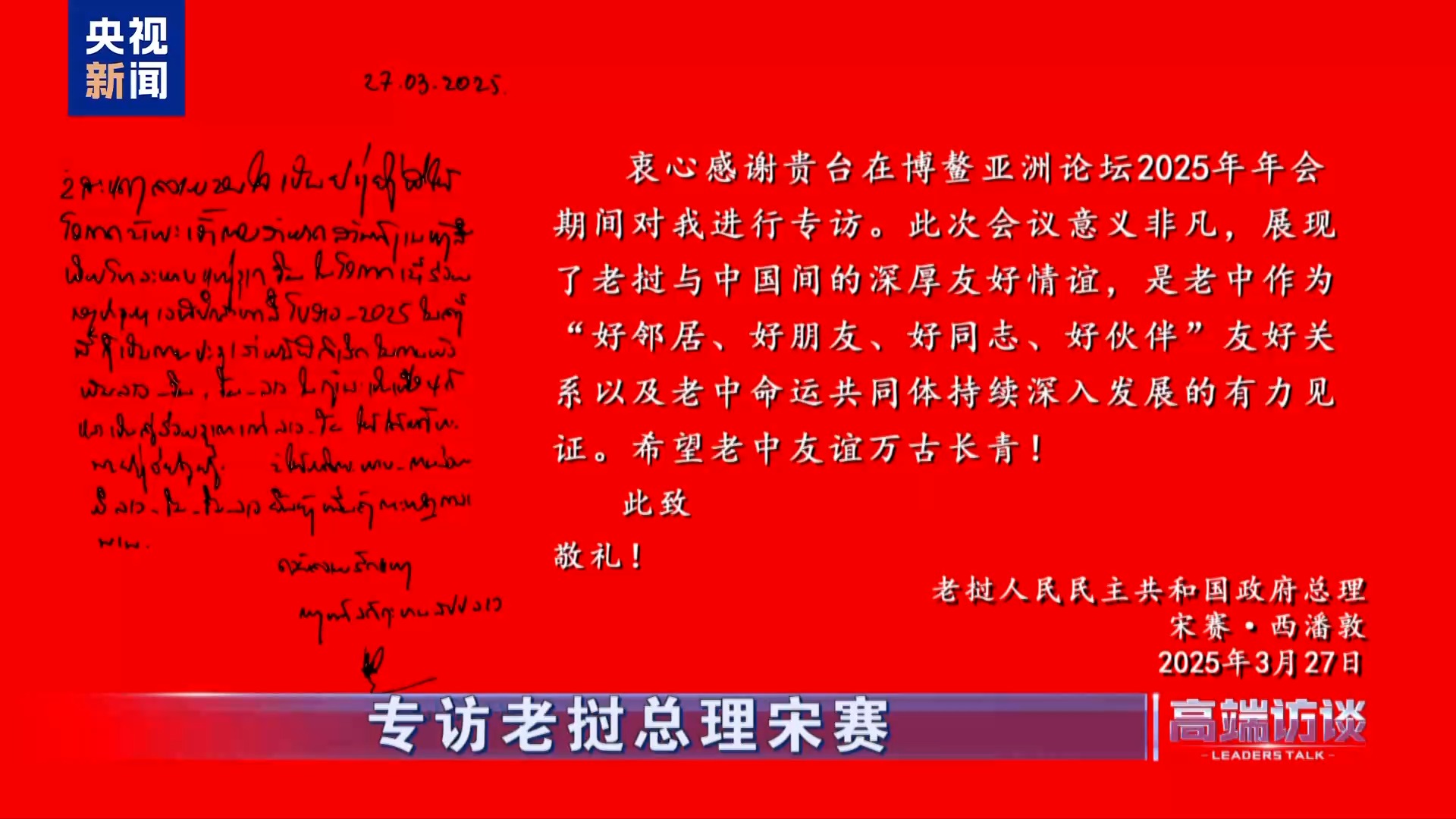 在专访中,宋赛总理回忆了小时候在中国求学的经历,以及中老两国人民之间的深厚情谊。他称赞中国为老挝、为世界的发展赋能。展望未来,他期待两国能在数字经济、清洁能源、人工智能等领域开展更多合作,续写“山水相连、民心相通”的友谊新篇章。
