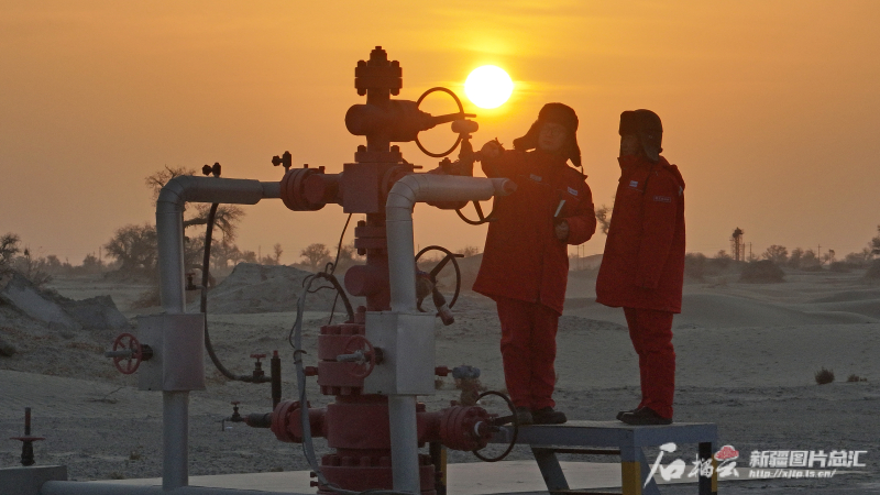 4月10日,两名巡井工人在满深7井检查井口设备运行情况。陈士兵摄