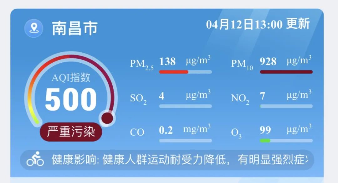 另外,江西省环境质量信息发布平台的数据显示,截至下午5点35分,南昌的实时空气质量指数已经达到了434,PM10达到了每立方米534微克,属于严重污染。