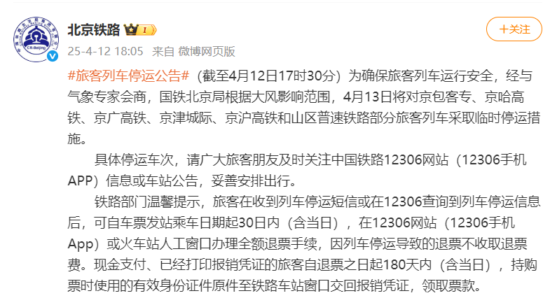 受极端天气影响,4月13日将对京包客专、京哈高铁、京广高铁、京津城际、京沪高铁和山区普速铁路部分旅客列车采取临时停运措施。请广大旅客朋友及时关注中国铁路12306网站(12306手机APP)信息或车站公告,妥善安排出行。