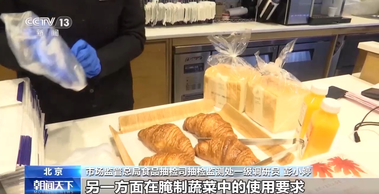 市场监管总局食品抽检司抽检监测处一级调研员 彭小婷:新国标对食品添加剂的使用进行了调整,一方面是对防腐剂脱氢乙酸的使用做出了更严格的要求,比如说禁止在面包糕点中加以使用;另一方面在腌制蔬菜中的使用要求,从原来的1.0克每公斤调减至了0.3克每公斤,更加严格了。