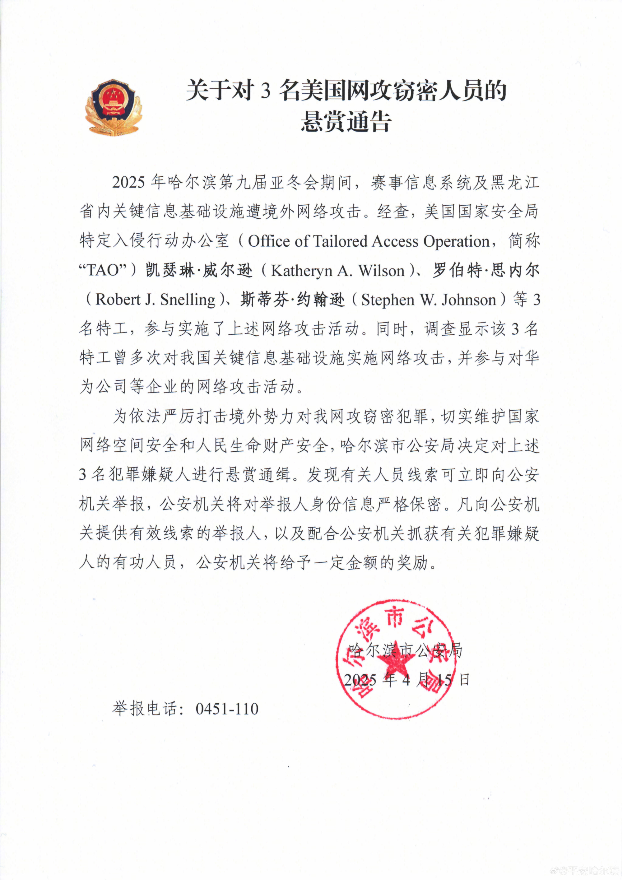 4月15日,哈尔滨市公安局官方微博发布悬赏通告,全文如下: