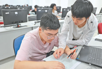 厦门大学马来西亚分校能源与化工学院工程制图课上,两名学生在讨论作业。