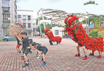 马来西亚中小学生在马来亚大学醒狮团组织的培训课上练习舞狮。