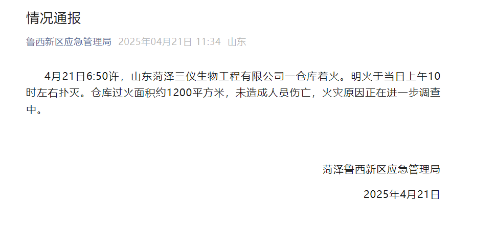 4月21日6:50许,山东菏泽三仪生物工程有限公司一仓库着火。明火于当日上午10时左右扑灭。仓库过火面积约1200平方米,未造成人员伤亡,火灾原因正在进一步调查中。菏泽鲁西新区应急管理局2025年4月21日