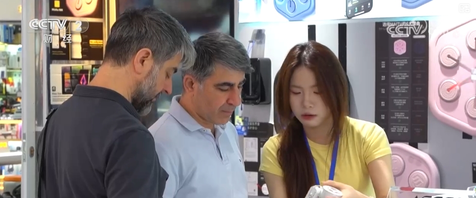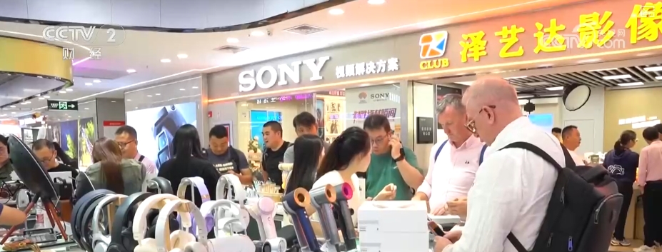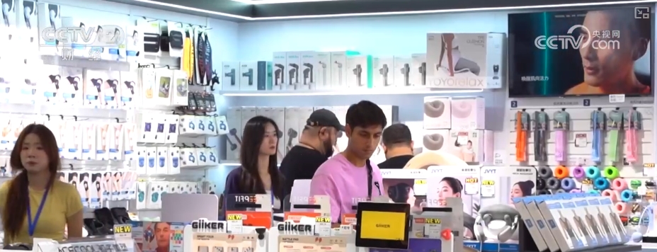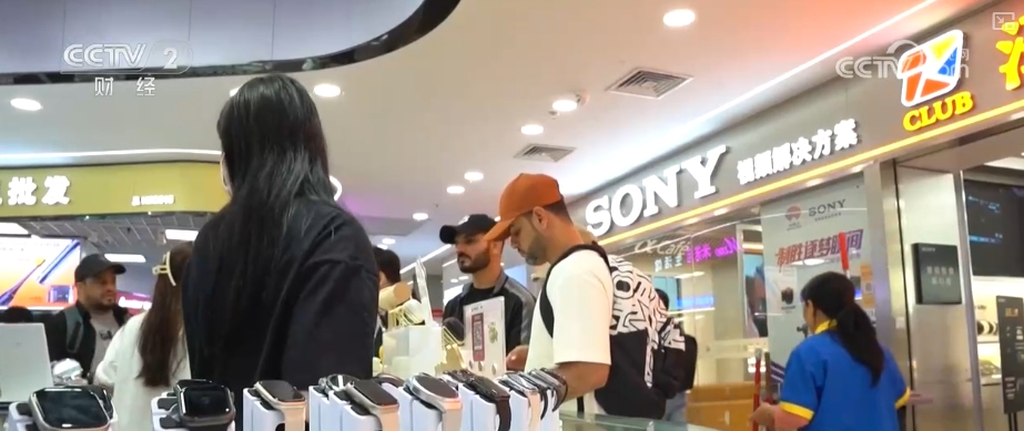 在2楼的整机零售商铺前,精致实惠的商品吸引了不少外国买家。门店负责人介绍,得益于免签入境、离境退税等政策,不少外国消费者专程来到华强北线下门店进行采购。而这些外国客户也成为他们继续开拓海外市场的商机。
