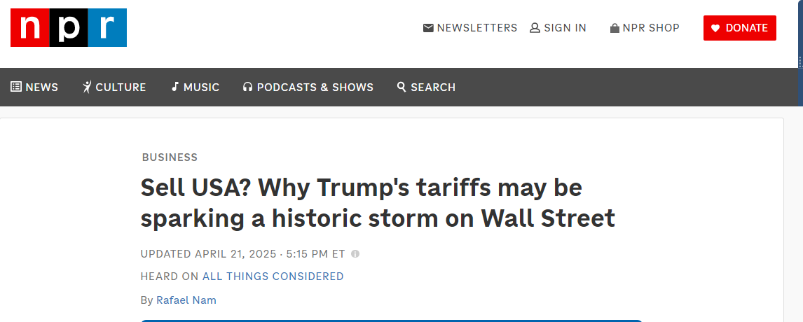 中国日报网4月22日电 据美国国家公共广播电台(NPR)网站4月21日报道,美国金融体系过去被视为全球最稳定和强大的体系之一。然而,由于美国现任政府4月2日推出的所谓全球“对等关税”政策,美国金融市场出现了前所未有的危机:全球投资者可能因美国政策的不确定性而对美国失去信心。