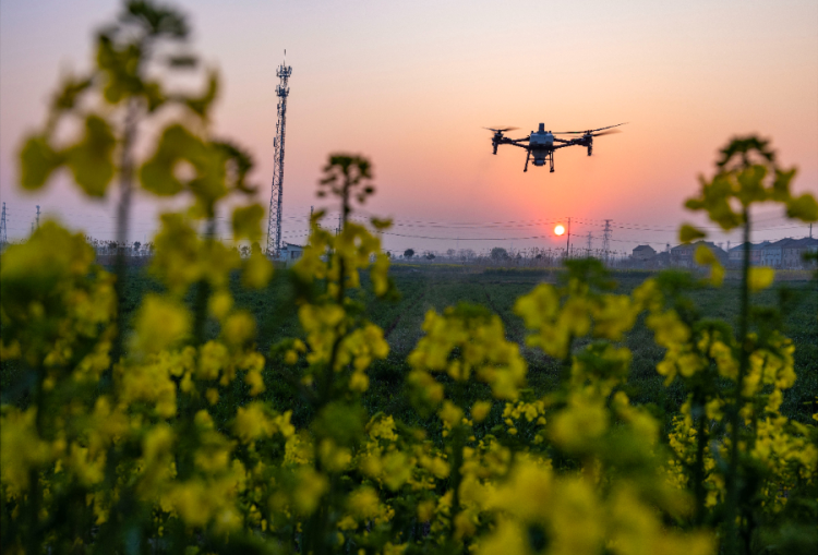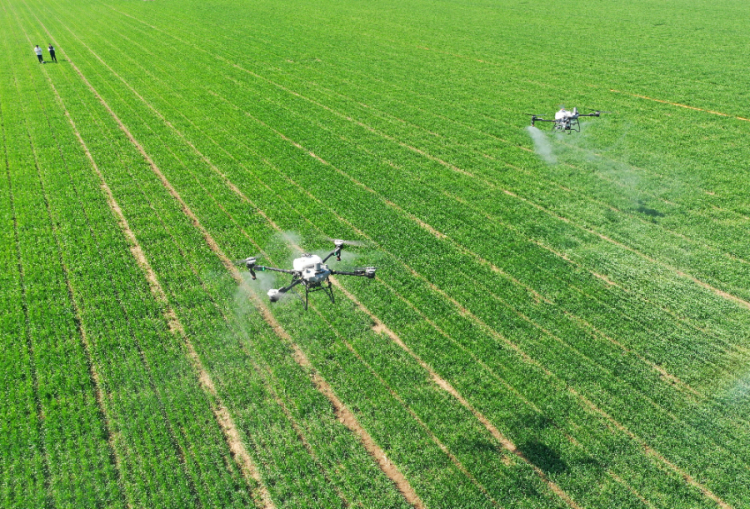 3月20日,在江苏省泰州市海陵区苏陈镇徐庄村,农技人员操作无人机进行小麦春管作业。新华社发(汤德宏摄)