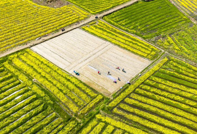 3月19日,在湖南省娄底市双峰县井字镇白碧村一处早稻集中育秧点,农民在秧田里劳作(无人机照片)。新华社发(李建新摄)