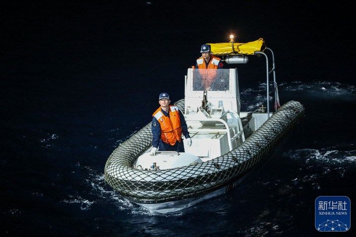 ↑2月16日,在中国黄岩岛附近海域,高栏舰海警执法员开展夜间吊放执法艇训练。