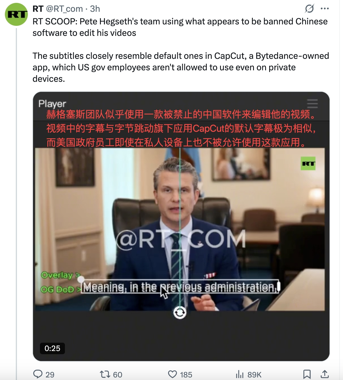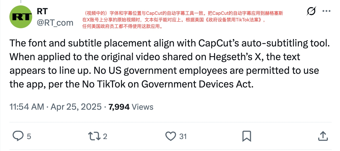 《今日俄罗斯》发现,赫格塞斯团队发布视频的字体、字幕位置与CapCut默认字幕高度相似;经测试,将视频导入CapCut后,原始视频文本与Capcut默认字幕可完全重叠。《今日俄罗斯》据此判断,赫格塞斯团队应是使用了Capcut编辑视频。