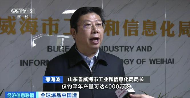 山东省威海市工业和信息化局局长 邢海波:威海市渔具全行业年产值100多亿元,仅钓竿年产量可达4000万支,销量占全球市场份额60%以上。