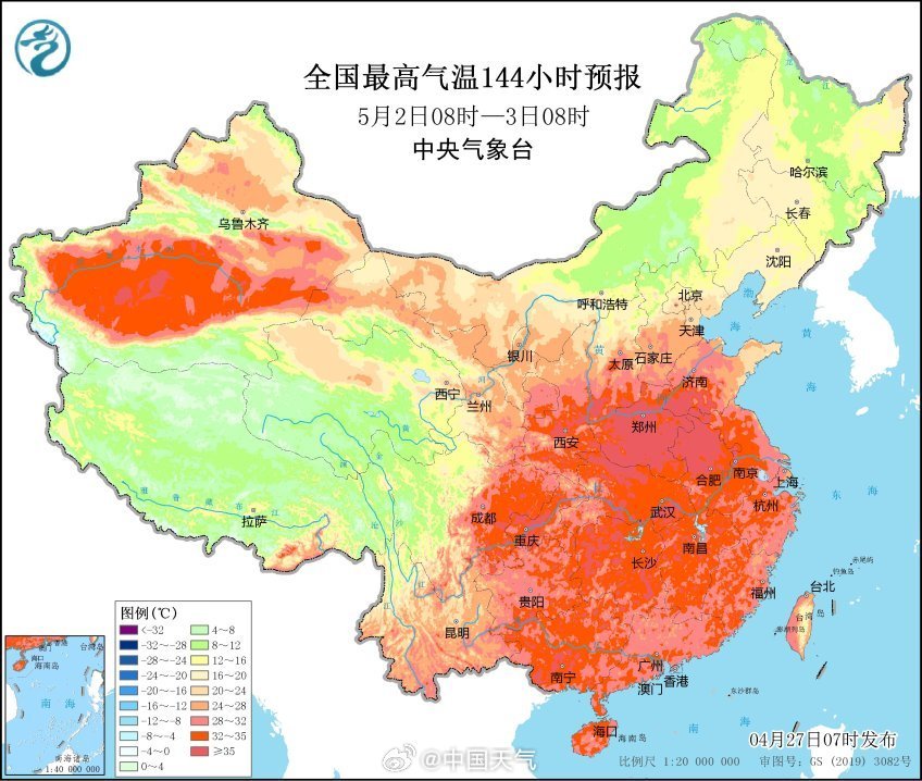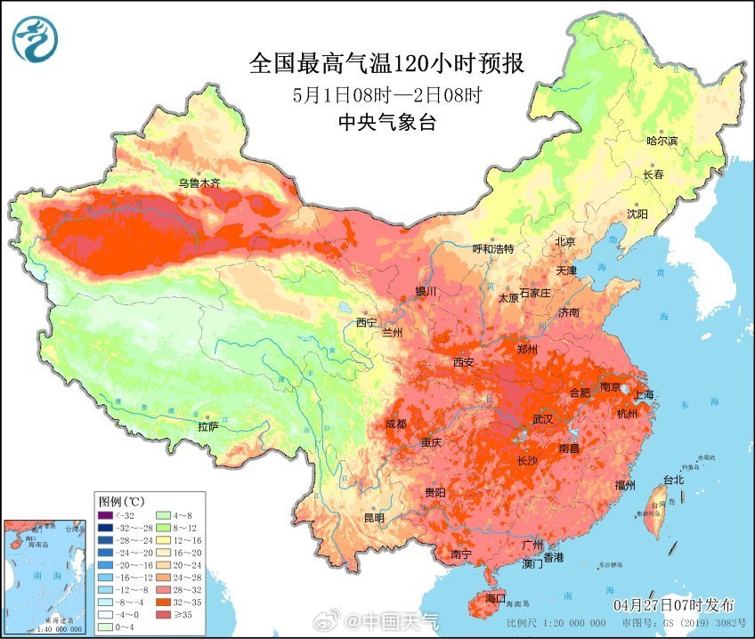 4月底开始,中东部又将迎来一波强势暖热。华北平原到江南、华南等地将有大范围的30℃以上区域,部分地区还会有高温出现。到5月2日,预计陕西中部和南部、山西南部、河南、湖北、湖南、贵州、广西北部、福建西部等地的部分地区有35℃以上的高温天气出现。
