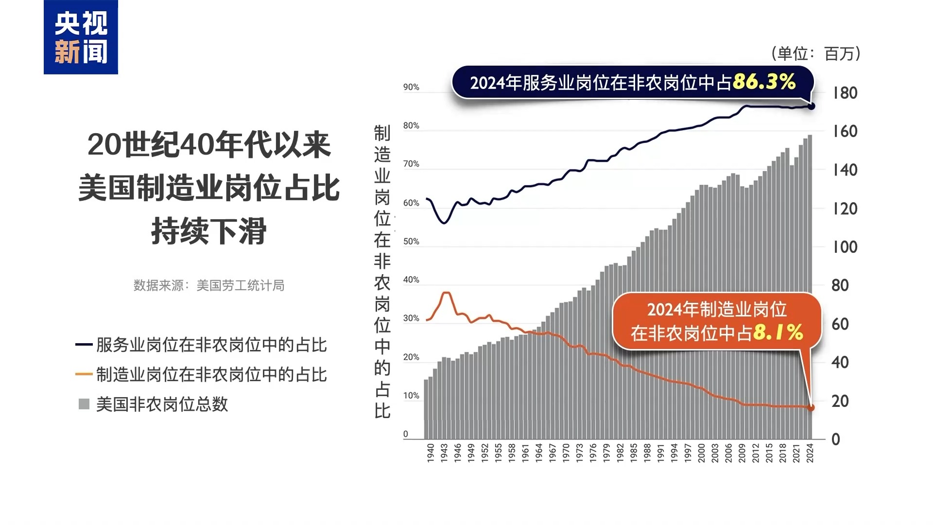 尽管美国政府宣称想要通过高关税来促使制造业回流,但越来越多的证据显示,这一“梦想”注定无法实现,制造业回流美国只是一个“伪命题”。 单从美国制造业就业人数来看,目前美国制造业岗位在非农岗位中占8.1%,大量岗位流向了服务业。另根据不完全数据统计显示,在美国总统特朗普第一任期到访过的十家工厂和工地中,有一家永久关闭,有一家终止主要业务,剩下正常运营的工厂也不同程度地面临各种挑战,其中一些还与白宫的关税政策有关。