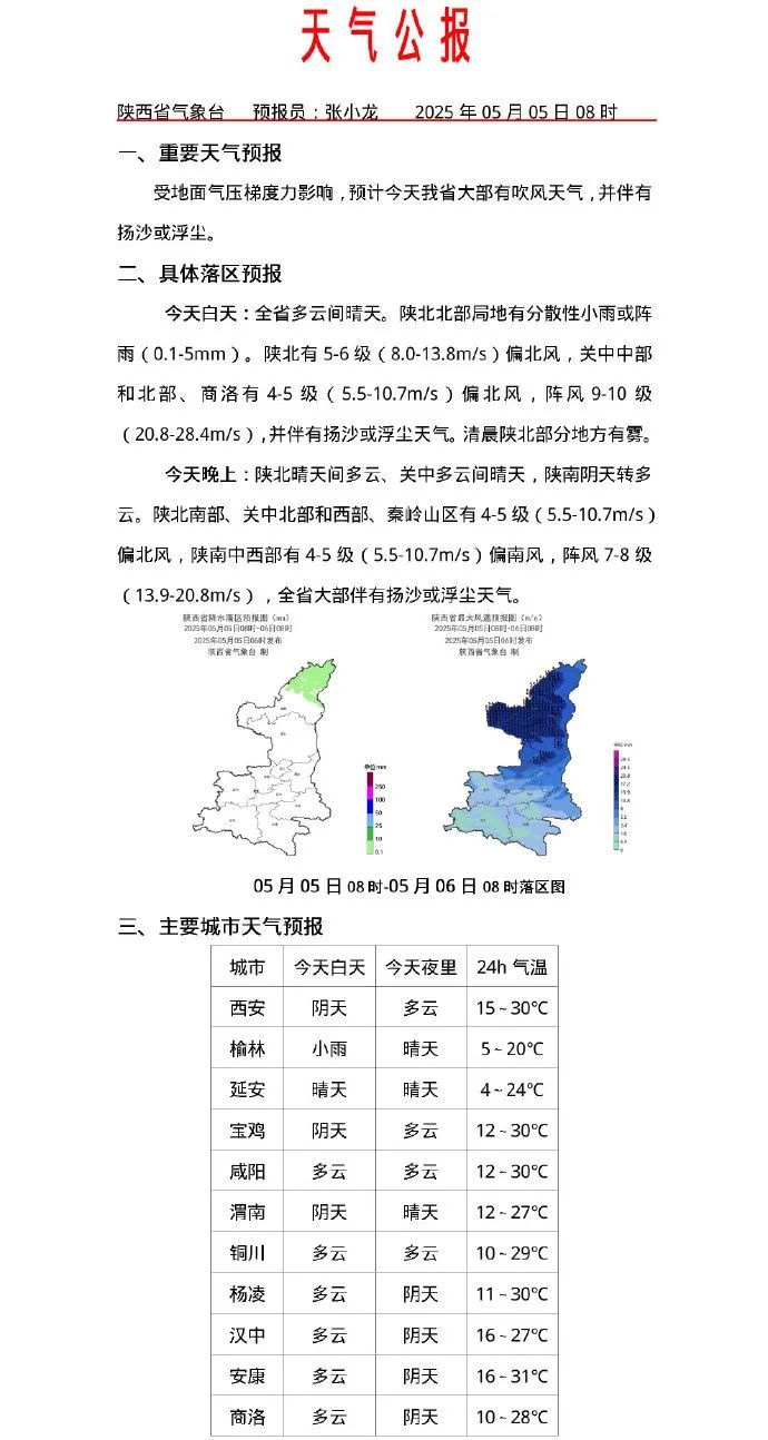 那最新天气情况如何呢?5月5日, 陕西气象发布最新预报称,受地面气压梯度力影响,预计今天我省大部有吹风天气,并伴有扬沙或浮尘。