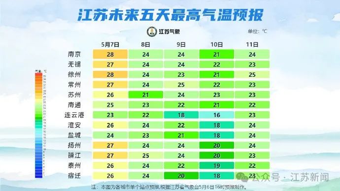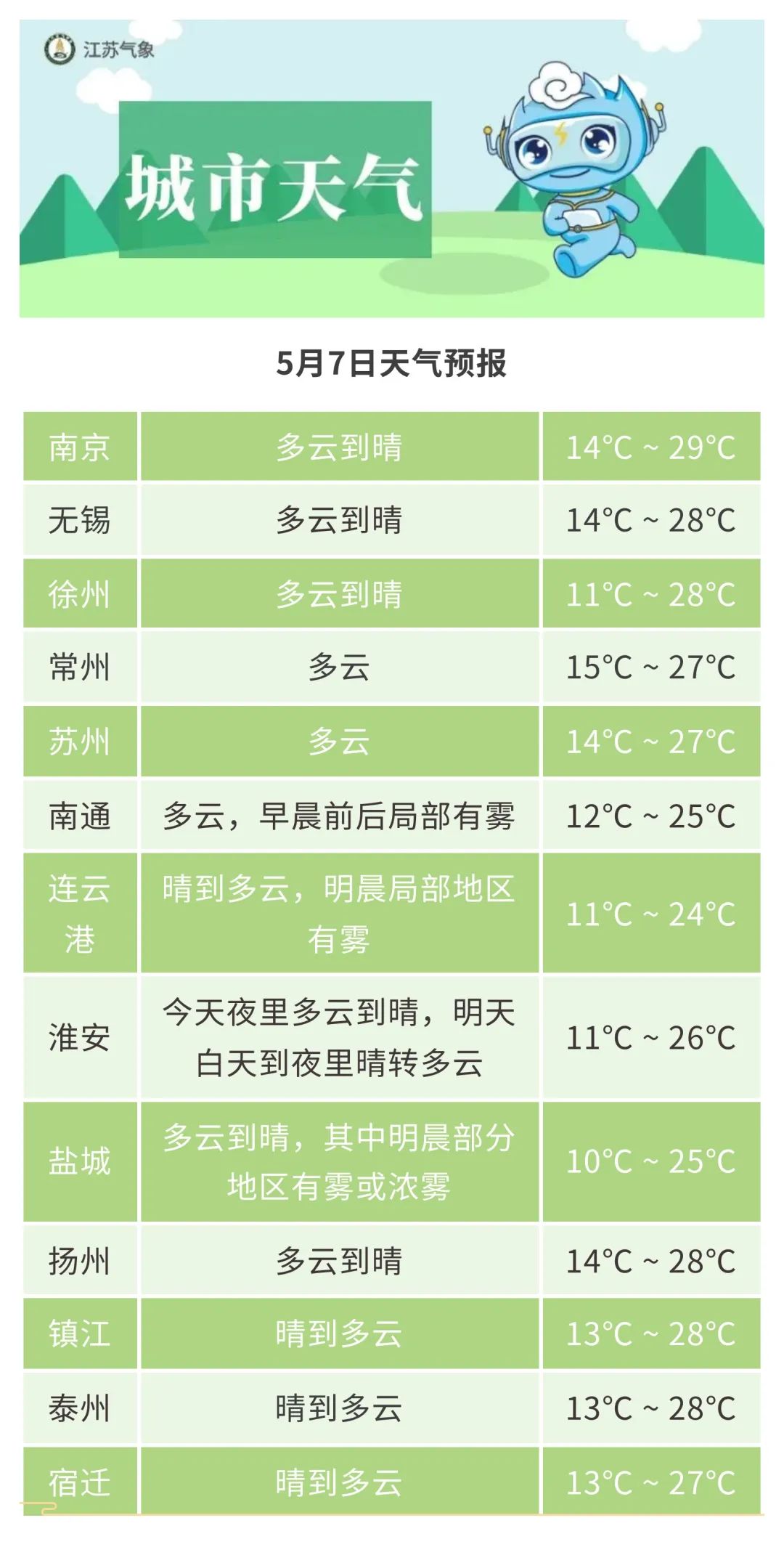 7日夜里全省多云到晴,8日白天全省多云转阴有阵雨或雷雨,其中淮河以南西部地区雨量中等,局部大雨,其他地区小雨。最高温度:苏南地区24~25℃,其他地区27℃左右;最低温度:江苏西南部地区18℃左右,江苏东部地区13~14℃,其他地区16℃左右。全省偏东风4-5级阵风6级逐渐增强至5-6级阵风7级,有雷雨地区雷雨时短时阵风8-9级。