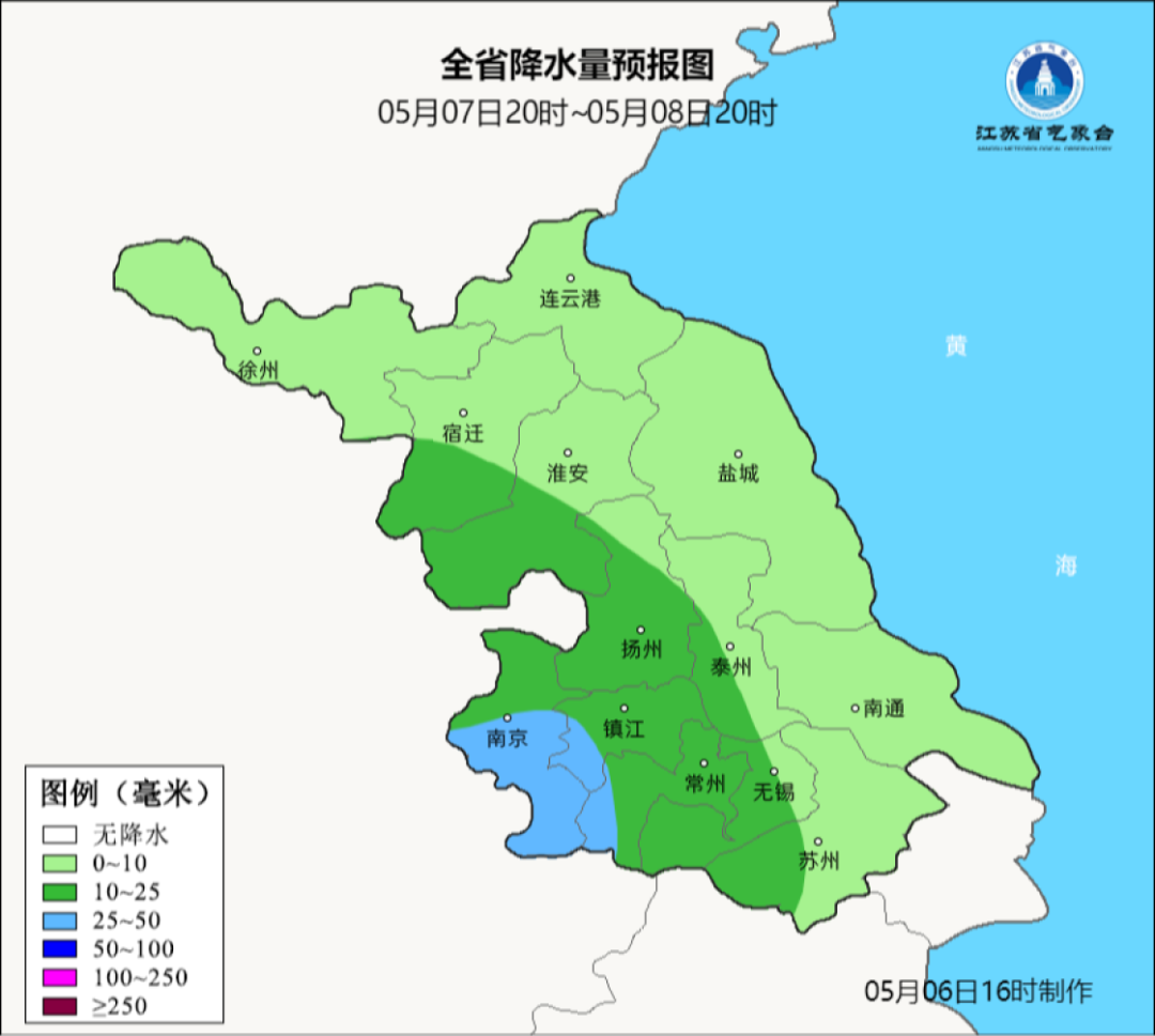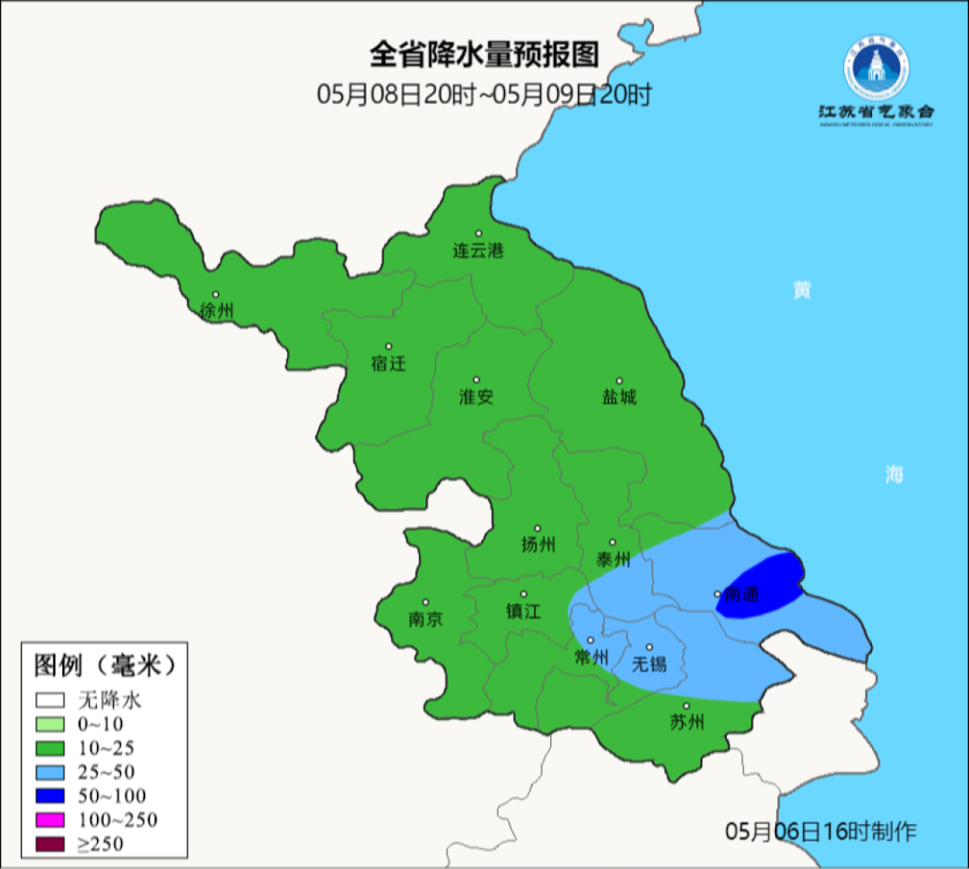 8日夜里全省阴有阵雨或雷雨,其中江苏东南部地区大雨,局部暴雨,其他地区中雨;9日白天全省阴有小雨并渐止转多云。最高温度:江苏东北部地区19~20℃,沿江和苏南地区25~26℃,其他地区23℃左右;最低温度:苏南地区18℃左右,淮北地区15~16℃,其他地区16~17℃。全省偏东风转偏西风,风力:沿淮及以南地区5-6级阵风7-8级,其他地区4-5级阵风6-7级,有雷雨地区雷雨时短时阵风8-9级。