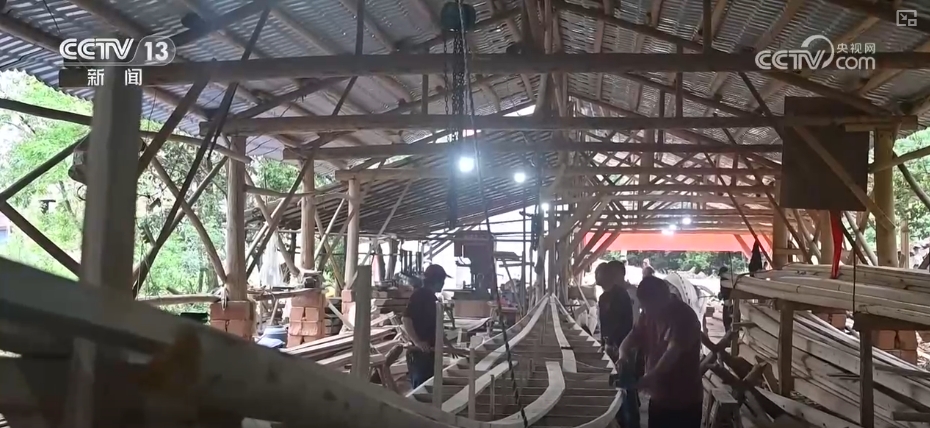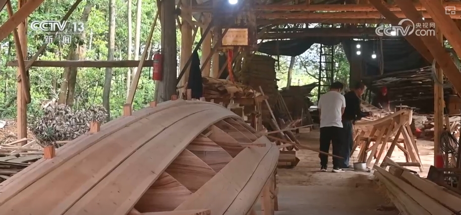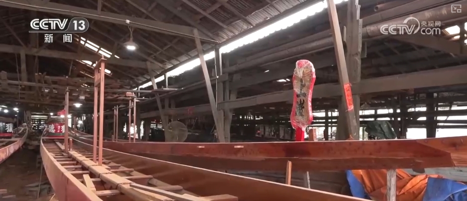 在浙江瑞安市安阳街道,一艘龙舟的舟身已经制作完成。龙舟制造师傅正细致地对舟身缝隙进行涂胶处理,而另一艘龙舟的制作也在紧锣密鼓地进行着。