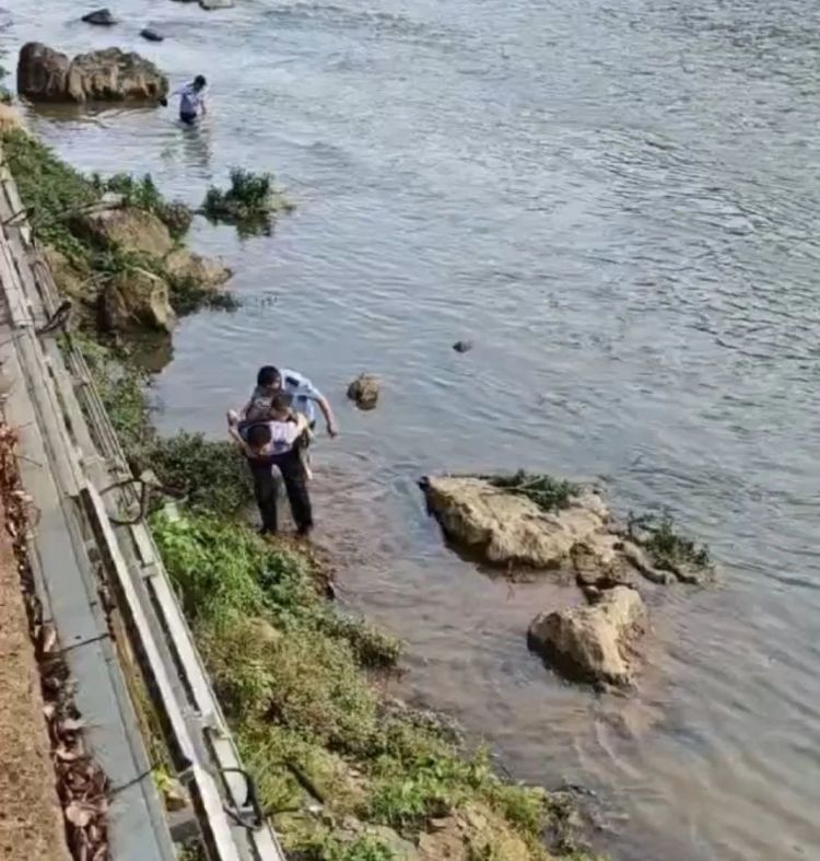 “水流太急,根本站不稳!”靠近岸边的王巨龙极力伸出双手够向三人。经过数分钟的努力,李代田和何海洋终于的将小赵拉到岸边,而此时的小赵早已脱力,无法站稳。民警王巨龙见状一把将小赵拉起,背到了背上,顺利上岸。