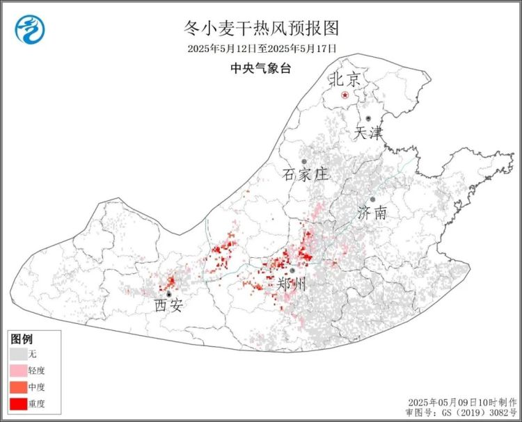 中央气象台预报显示,从5月12日开始,黄淮中西部、华北南部、陕西关中等地气温明显偏高,16至17日上述大部地区将有35℃以上高温天气,局地最高气温可达37℃以上。河南安阳、焦作、新乡、洛阳、郑州、许昌,陕西关中,河北邯郸,山西运城、临汾等地将出现轻至重度干热风天气,主要影响时段为12日、15至17日。